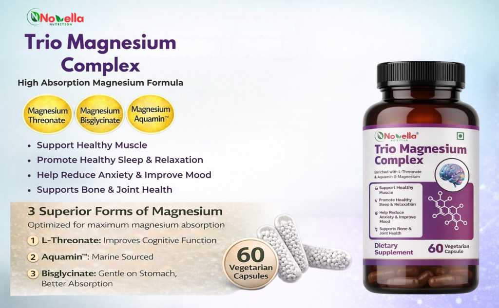 Novella Nutrition Trio Magnesium Complex 1000 mg | Enriched With Magnesium L- Threonate, Aquamin Citrate & Glycinate | Supports Healthy Muscle, Nerve & Bone Health, Promotes Healthy Sleep & Muscle Recovery | High Absorption Formula – 60 Veg Capsules